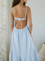 Travel heals the soul, and comfort makes every journey special. This backless white maxi dress, with its spaghetti straps and flowing silhouette, offers effortless elegance. Available in other colors, it's perfect for sunlit adventures and serene moments.